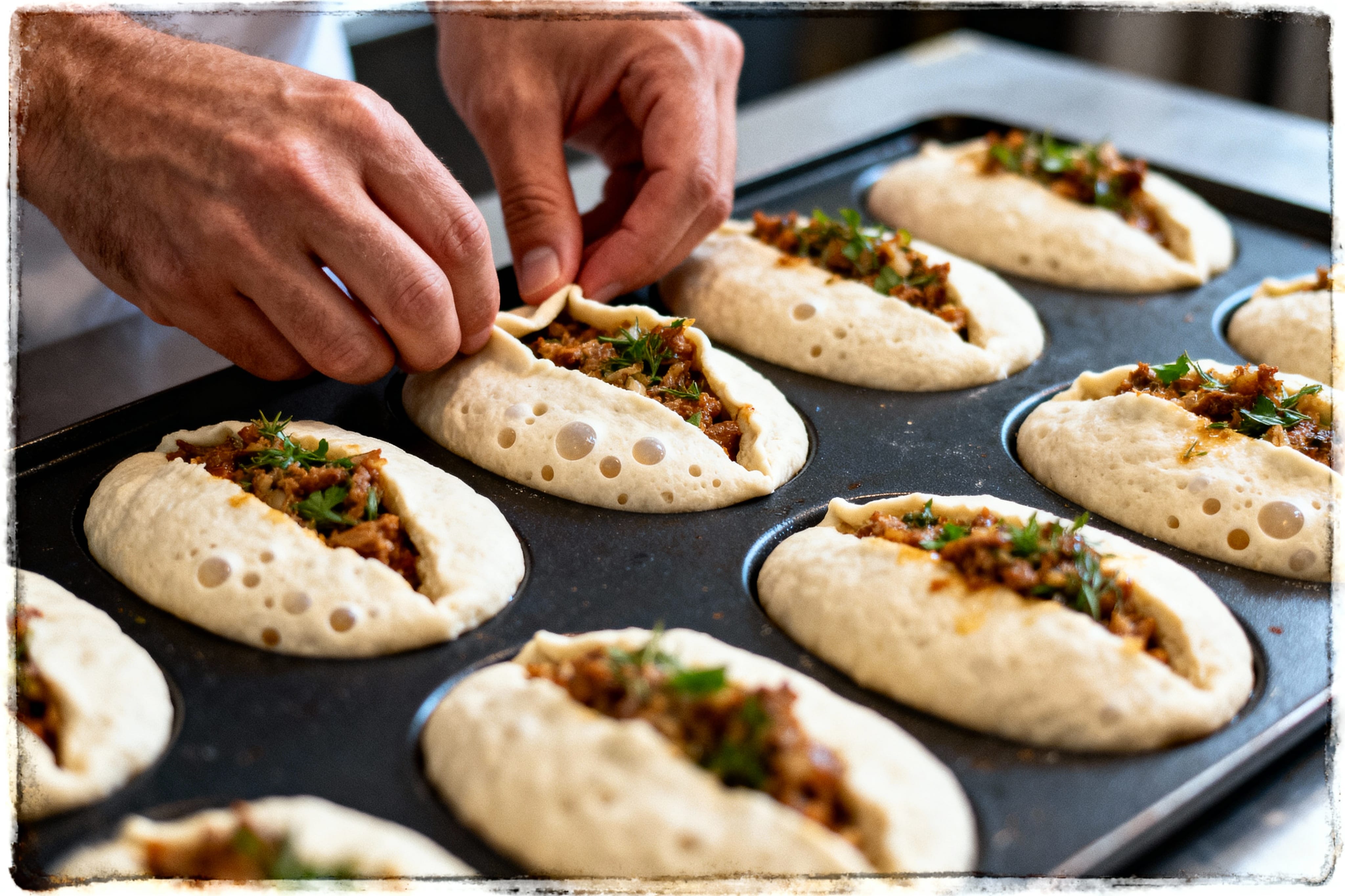 Le façonnage demande un tour de main particulier. Étalez chaque portion de pâte en cercle, plus épais au centre qu’aux bords. Cette technique permet un meilleur maintien de la farce et évite que les bords ne se déchirent.
