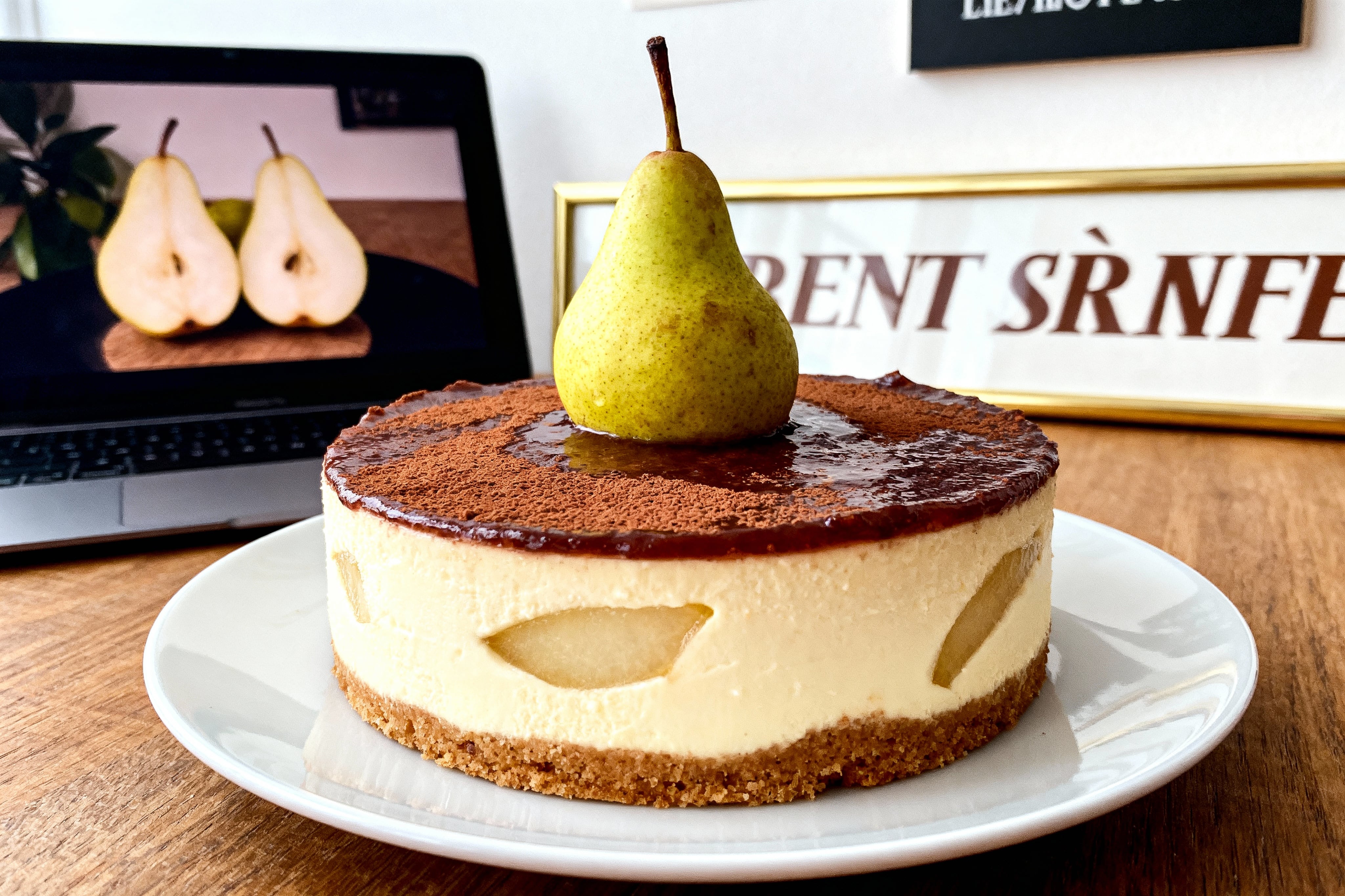 La présentation visuelle valorise considérablement votre création. Décorez le dessus de votre entremet avec des tranches fines de poire fraîche disposées en éventail.